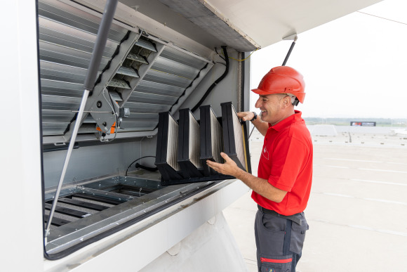 Unitățile sunt instalate pe cadre de acoperiș prefabricate și pe conducte de acoperiș, iar toate lucrările de instalare și întreținere se realizează de pe acoperiș. Mai mult, toate componentele care necesită manopere pot fi, de asemenea, accesate de pe acoperiș, ceea ce înseamnă că lucrările de întreținere și service regulate pot fi efectuate fără a afecta infrastructura și procesele de lucru din hală. Acest lucru reduce timpii de inactivitate pentru utilajele de producție și facilitează planificarea lucrărilor de întreținere.