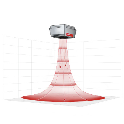 Unitatea de recirculare este instalată sub tavan. Acesta preia aerul din cameră, îl încălzește sau îl răcește și îl distribuie înapoi în cameră prin injectorul de aer. Unitatea de alimentare cu aer este instalată pe acoperiș și alimentează hala cu aer proaspăt la temperatura setată, având alimentarea opțională cu aer proaspăt. Datorită performanței lor ridicate și distribuției eficiente a aerului, unitățile TopVent acoperă o suprafață mare. Prin urmare, în comparație cu alte sisteme, sunt necesare mai puține unități pentru a obține climatul interior dorit.
