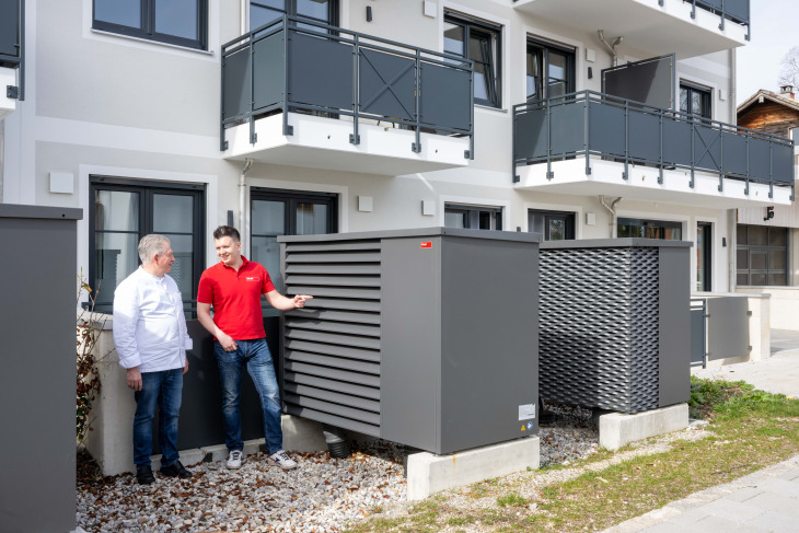 “Cu Belaria Pro, ajungem la nivelul optim de temperatură de 60 de grade pentru apă caldă menajeră și 55 de grade pentru apa de încălzire.”, spune Moosbauer. Pentru noua clădire din Otterfing, Bavaria, au fost instalate trei pompe de căldură Belaria Pro (24) – una care deservește toate apartamentele și două pentru zona hotelului.