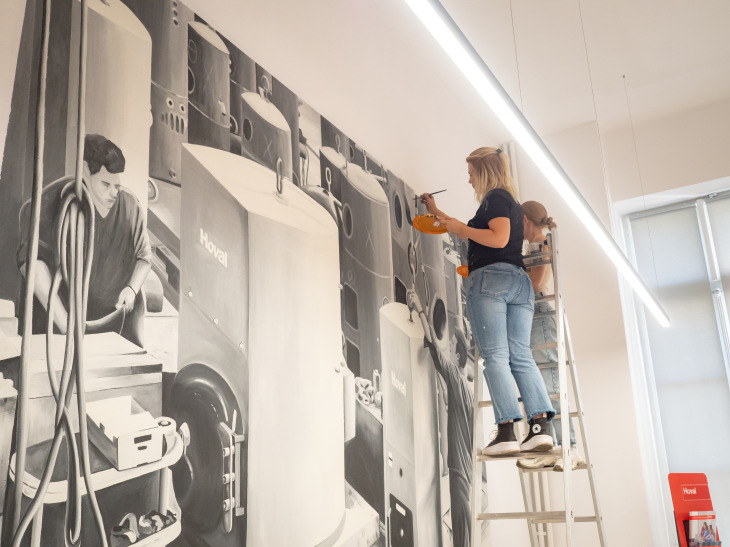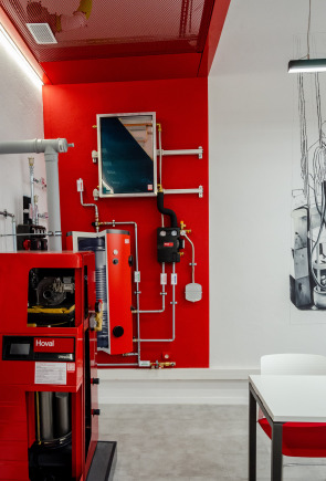 Transparența joacă un rol esențial. Tabla expandată, prin care se pot vedea componentele tehnice, simbolizează angajamentul Hoval pentru eficiență și claritate.