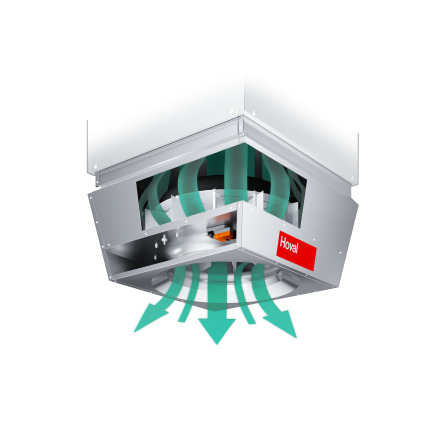 Rezultatul este un profil stabil al temperaturii pe întreaga înălțime a halei, ideal pentru spații cu înălțimi cuprinse între 5 și 25 de metri. Diferențele de temperatură dintre zona de la nivelul pardoselii și cea de sub acoperiș sunt reduse semnificativ, iar stratificarea termică este controlată eficient.